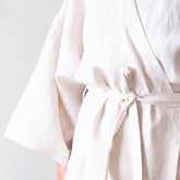 An oversized robe with a generous front wrap, a rectangular kimono style sleeve, elongated collar, turned-back cuff and hem, a removable waist tie, and front patch pocket. Finished with french seams.